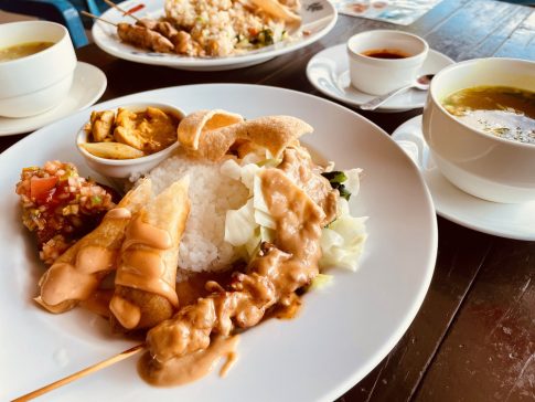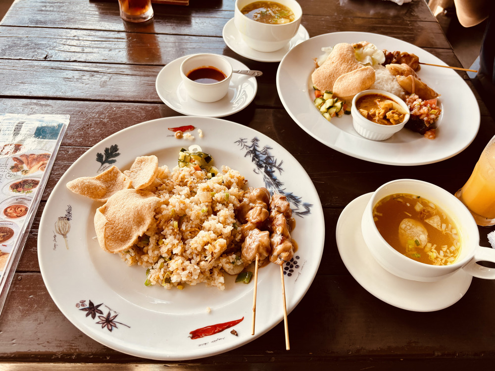 さらに、香ばしい若鶏のサテ(串焼き)やエビせんべい、そして箸休めにもぴったりのアチャール(インドネシアのピクルス)、スープまで付いており、ボリュームも満点です。