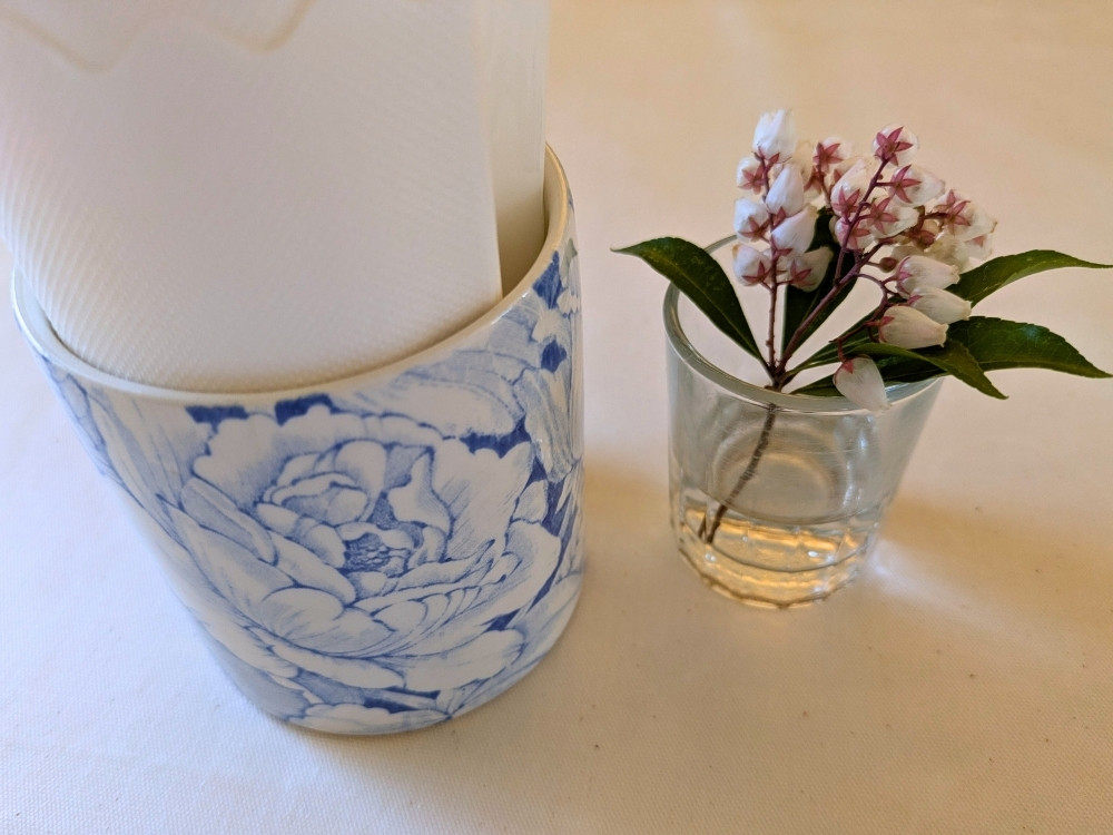 席に案内されると、テーブルには鈴蘭が飾られていました。ペーパーナプキンが入っている陶器のデザインもとてもかわいいですね。