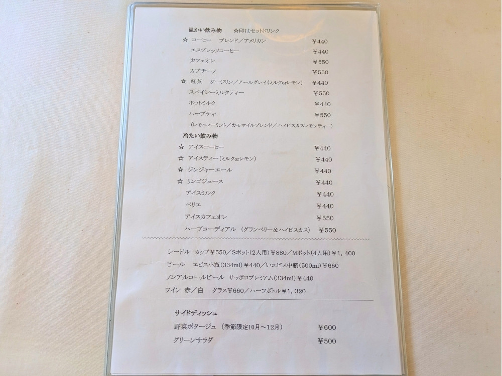 ドリンクのメニューも豊富で、コーヒーや紅茶だけでなくハーブティーの種類も多くあります。アルコールも扱っており、ガレットとシードル(りんごの発泡酒)の組み合わせがよく合うそうですよ。私は車で来ていたので、残念ながらお酒は諦めましたが、次回はぜひ同行者を連れてシードルを飲みたいと思います。