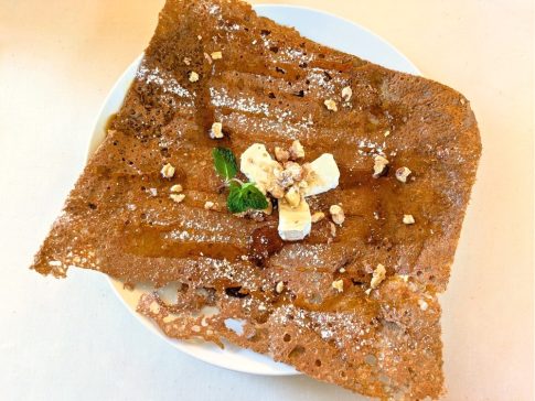 今回は「ラタトゥイユのガレット」と、デザートに「蕎麦の花のハチミツ カマンベール&クルミ添えのガレット」を注文しました。多いかな、と思いましたが、生地がパリパリの軽い食感で、するすると食べ進められました。