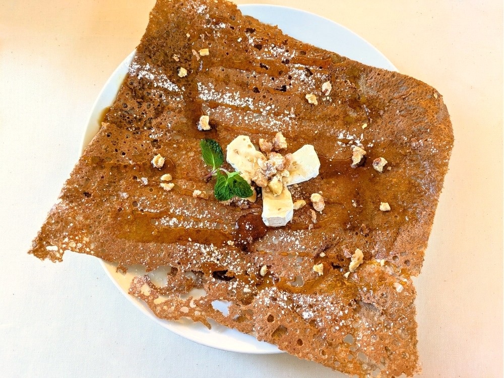 こちらは蕎麦の花のハチミツとカマンベール&クルミ添えのガレットです。蕎麦の花のハチミツは初めていただきましたが、色が濃く独特な香ばしさと甘みがあります。カマンベールチーズ・クルミとの相性もとても良いです。