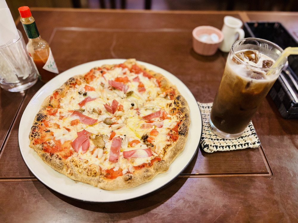 続いてBセットは、ベーコン・きのこのピッツァです。あつあつの状態で提供される丸々一枚のピザは、見た目にも満足感があり、チーズがたっぷりと溶け合います。